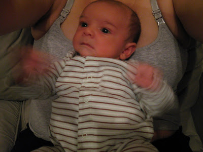 We've noticed that he seems more aware of his surroundings. He can follow a moving object with his eyes. He likes to look out the window while getting his diaper changed. He will look at his reflection in the bathroom mirror and also in the mirror over the carseat. He's noticed the little frog toy that we hung from the handle of the carseat. Also, lately he likes to sit on my lap facing away from me so he can look around: